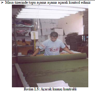 Kumaş geniş bir masaya yayılarak, aşama aşama top açılır ve kontrol edilir.