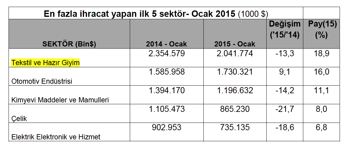 Türkiye İhracatçılar Meclisi tarafından açıklanan rapora göre, 2015 yılı Ocak ayında ihracat miktarı geçen yılın aynı ayına göre % 9,8 düşüşle 10 milyar 803 milyon 970 bin dolar olarak açıklandı. TİM’in ( Türkiye İhracatçılar Meclisi) açıklamasına göre, son 12 aylık ihracat ise yüzde 2,5 artışla 156 milyar 118 milyon 816 bin dolar olarak belirtildi.
